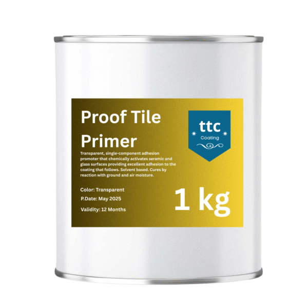 Proof Tile Primer : Transparent, single-component adhesion promoter that chemically activates ceramic and glass surfaces providing excellent adhesion to the coating that follows. Solvent based. Cures by reaction with ground and air moisture.